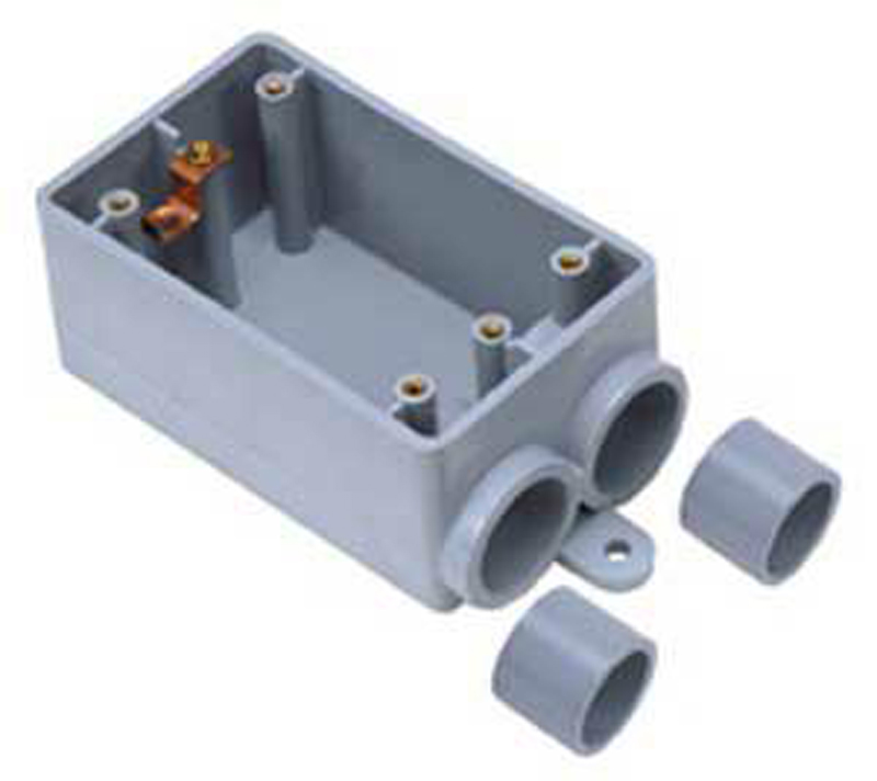 Weatherproof Device Box, Single-Gang, Grey PVC, for 1/2" & 3/4" conduit (2x end connections)