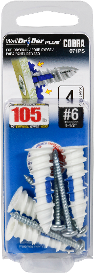 Screw Anchor, Wall Driller Plus, Plastic, with #6 Screws, 4/pkg