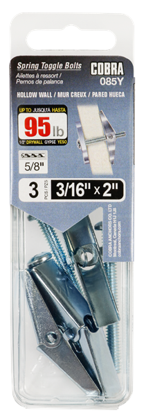 Spring Toggle Bolt, 3/16" x 2", 3/pkg