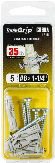 Designed with two expandable wings that grip tightly behind the drywall for a maximum holding power.