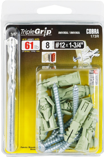 Screw Anchor, Triple Grip, Plastic, with #12 Screws & Drill Bit, 8/pkg