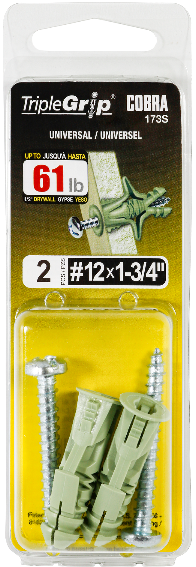 Screw Anchor, Triple Grip, Plastic, with #12 Screws, 2/pkg