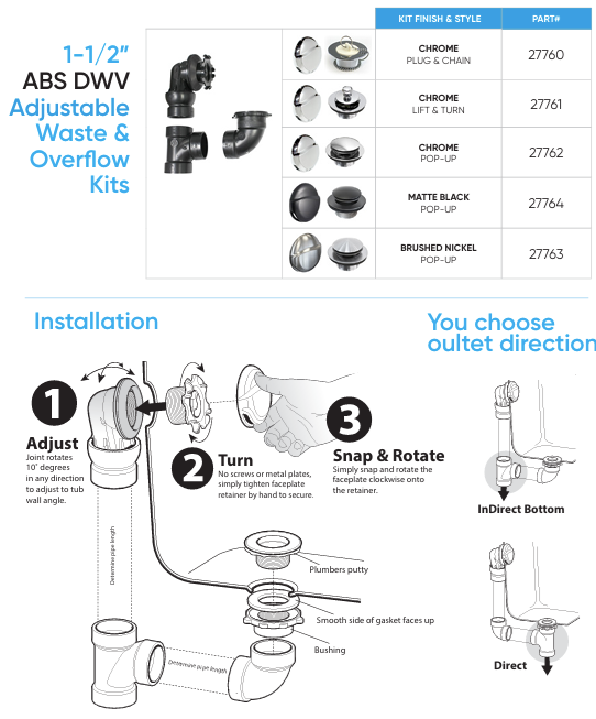 Overflow pivots ten degrees up/down and right/left to accommodate tub design