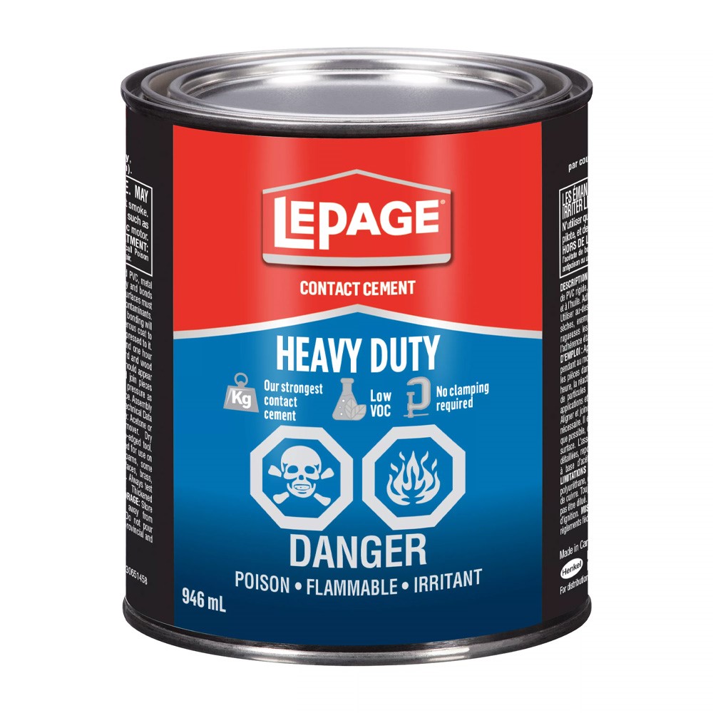LePage Heavy Duty Contact Cement was designed for use on flat and close mating surfaces and is recommended for bonding wood, laminates, leather, cork, rigid PVC, metal and many other materials.