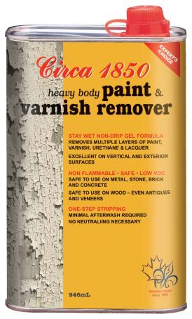 Circa 1850 heavy body paint and varnish remover quickly and easily strips off multiple layers of oil, latex and epoxy paint, oil and latex varnish, polyurethane, moisture cure, lacquer and shellac. Its gel formula is ideal for exterior use and vertical surfaces. Safe to use on fine furniture will not raise wood grain, harm most glue joints or veneers, or damage patina. May soften plastic and fiberglass. Circa 1850 heavy body paint and varnish remover is non-flammable and almost odorless.