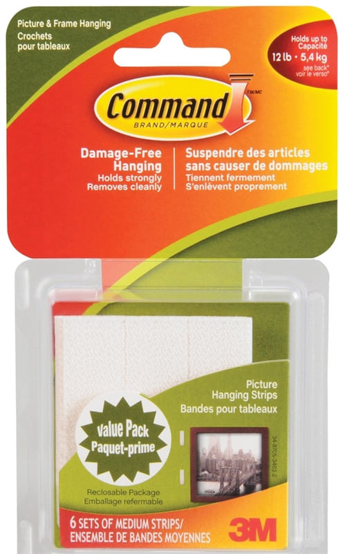 Picture Hanging Strips, Self-Adhesive, Medium, 3M Command, 6/pkg (17204C) 12 lb capacity