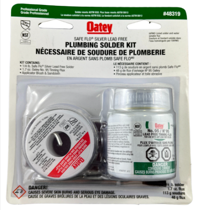 Oatey® Safe-Flo® Lead-Free Solder Kits include wire solder, flux, abrasive cloth and an application brush to make the soldering job easier.