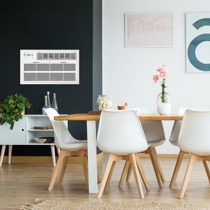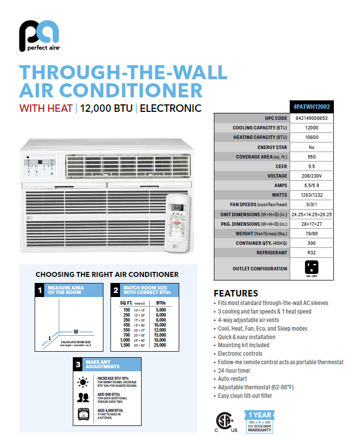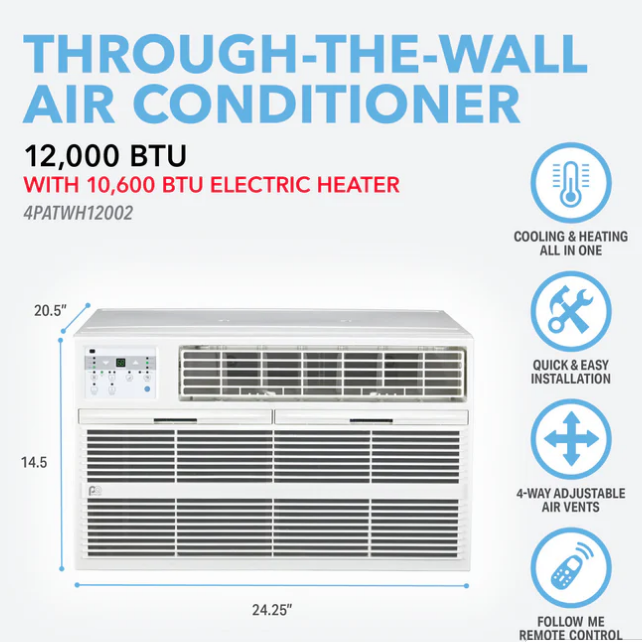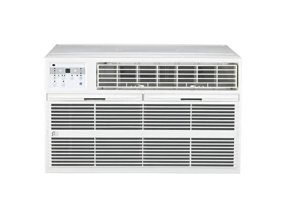 This versatile through-the-wall air conditioner goes with the flow of the weather, so you stay comfortable in any season. With a 12,000 BTU capacity, this Perfect Aire unit is engineered with an electric heater to warm or cool spaces up to 550 square feet. Find your comfort zone with adjustable temperature settings, full-range air direction control and three fan speeds. Heading to the kitchen to prep dinner? Keep the temperature right where you want it from afar with a handy remote that acts as a portable thermostat for total room coverage.