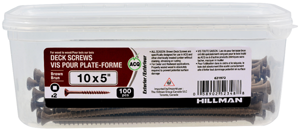 SPECIFICATIONS Ceramic-coated screws for use with pressure-treated lumber. FEATURES & BENEFITS Flat head with socket (Robertson) drive Fast-start tip Resists pull-out OTHER INFORMATION "Cedar" colour for use with brown pressure-treated lumber