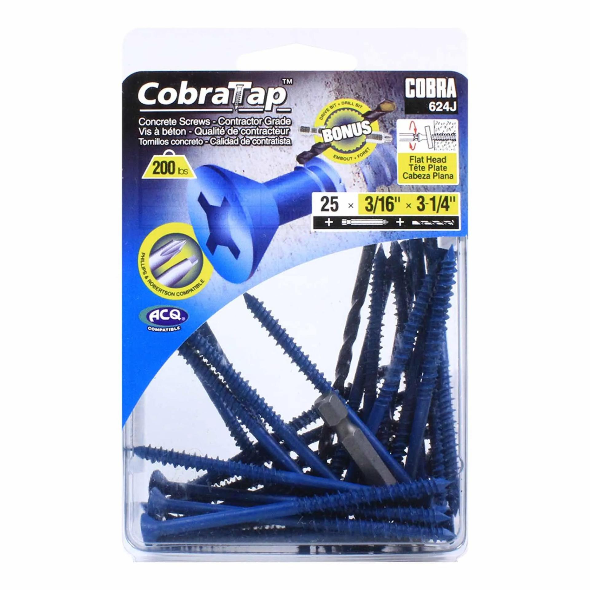 Concrete Screws, Flat Head, 3/16" x 3-1/4", with Drill Bit, 25/pkg