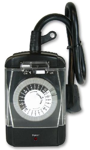Outdoor timer has two 3-prong grounded outlets, allowing the timer to control two devices from one outlet.