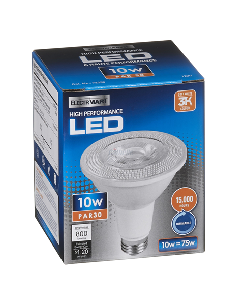 Light Bulb, LED, Reflector PAR30, 10 Watt, Warm White. Dimmable, 1/pkg, Electrimart
