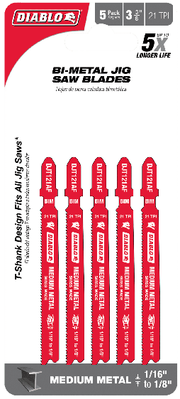 Jig Saw Blade, T-Shank, 21 TPI x 3-5/8" (medium metal cutting) 5/pkg, Diablo Bi-Metal