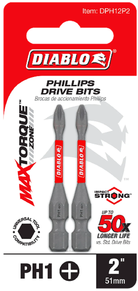 Power Bit, Phillips #1 x 2", 2/pkg, Diablo