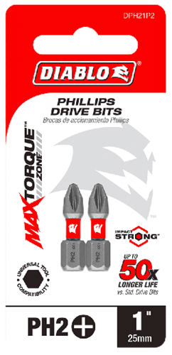 Diablo's driver bit range of Phillips bits delivers maximum performance, extreme durability and up to 50X longer life when installing and removing fasteners.