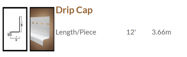 Drip cap is a vinyl siding accessory used above windows and doors to channel water away from the wall. An essential component to prevent water damage.