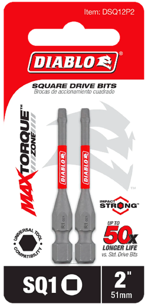 Diablo's driver bit range of Square bits delivers maximum performance, extreme durability and up to 50X longer life when installing and removing fasteners.