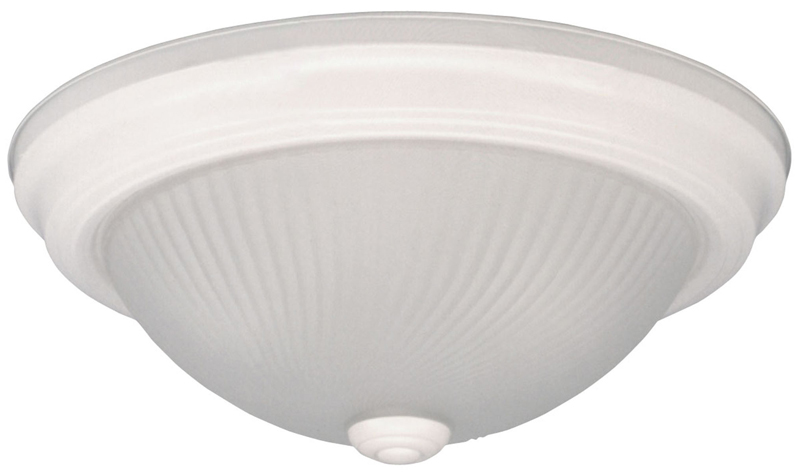 SPECIFICATIONS Basic flush mount ceiling fixture with white metal finish and frosted "swirl"-pattern glass. FEATURES & BENEFITS Requires 2x Type "A" bulbs (not included), 40W incandescent or LED equivalent OTHER INFORMATION 11" diameter, 4-3/4" high