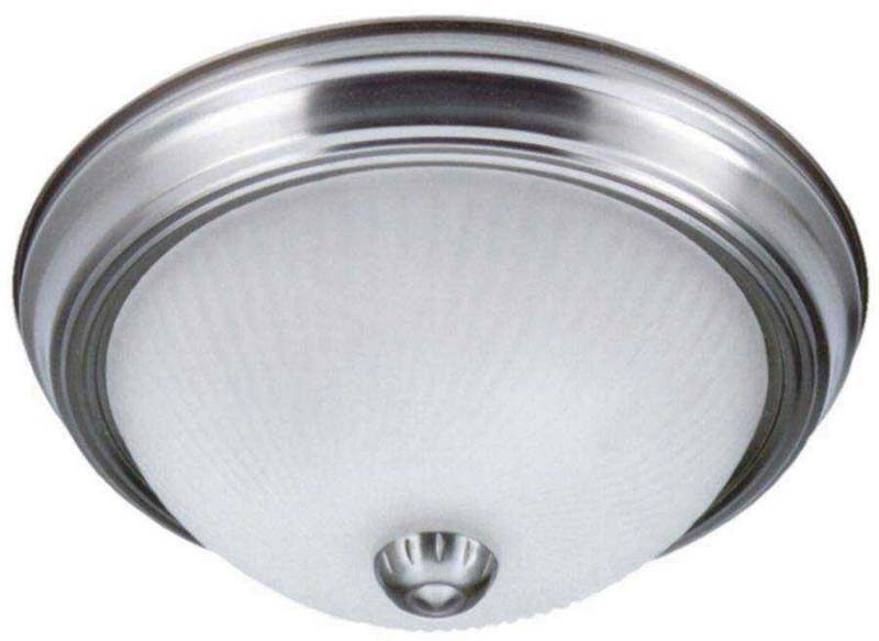 Basic flush mount ceiling fixture with brushed metal finish and frosted "swirl"-pattern glass.
