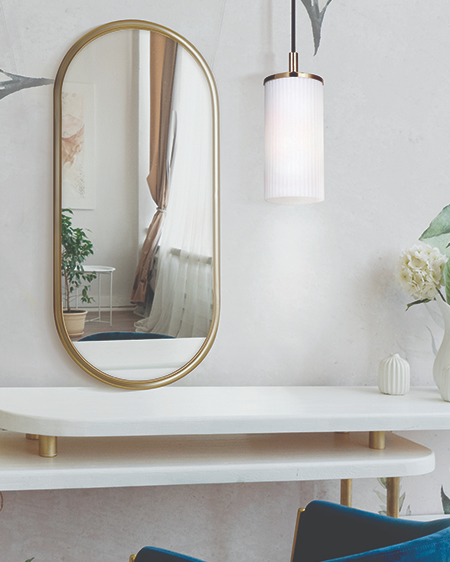 KINSLEA adorns an appealing white ribbed glass against a beautiful, gold finish, drawing eyes to its beautifully executed details.
