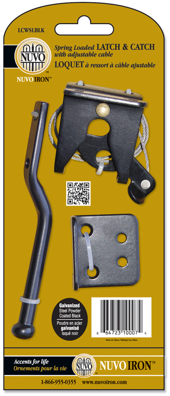 Gate Latch and Catch, with Cable & Ring, Spring Loaded, BLACK, Nuvo