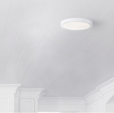 Modern, low-profile light with white finish and frosted acrylic lens, suitable for ceiling or wall mount