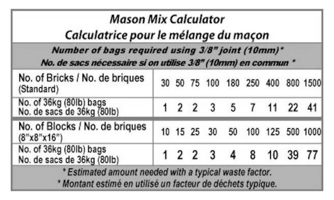Each 80 lb (36.2 kg) bag of QUIKRETE? Mason Mix will lay up to 37 standard bricks or13 standard (8 in by 8 in by 16 in [200 mm by 200 mm by 405 mm]) blocks.