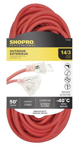 Extension Cord, Outdoor, 15 Meter, 14/3 SJTW, 3 Outlets w/Lit Fantail, RED