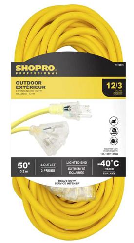 Extension Cord, Outdoor, 15 Meter, 12/3 SJTW, 3 Outlet Lighted Fantail, YELLOW