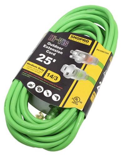 Extension Cord, Outdoor, 25 feet, 14/3 SJTW, 1 Outlets w/Indicator Light, GREEN