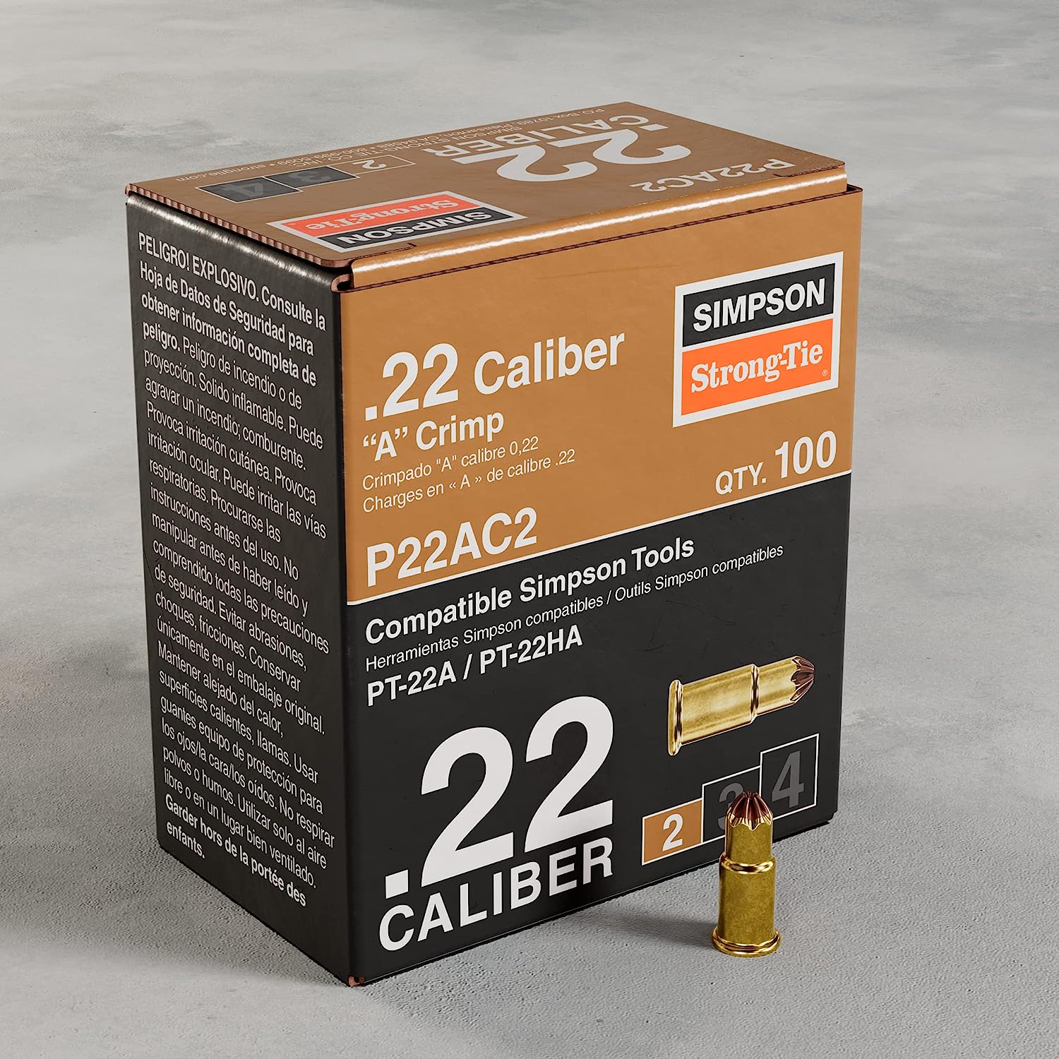 Simpson Strong-Tie P22AC .22 caliber "A" crimp loads are compatible with PT-22A, PT-22HA tools and other common low-velocity, single-shot powder-actuated tools. Available in levels 2–4.