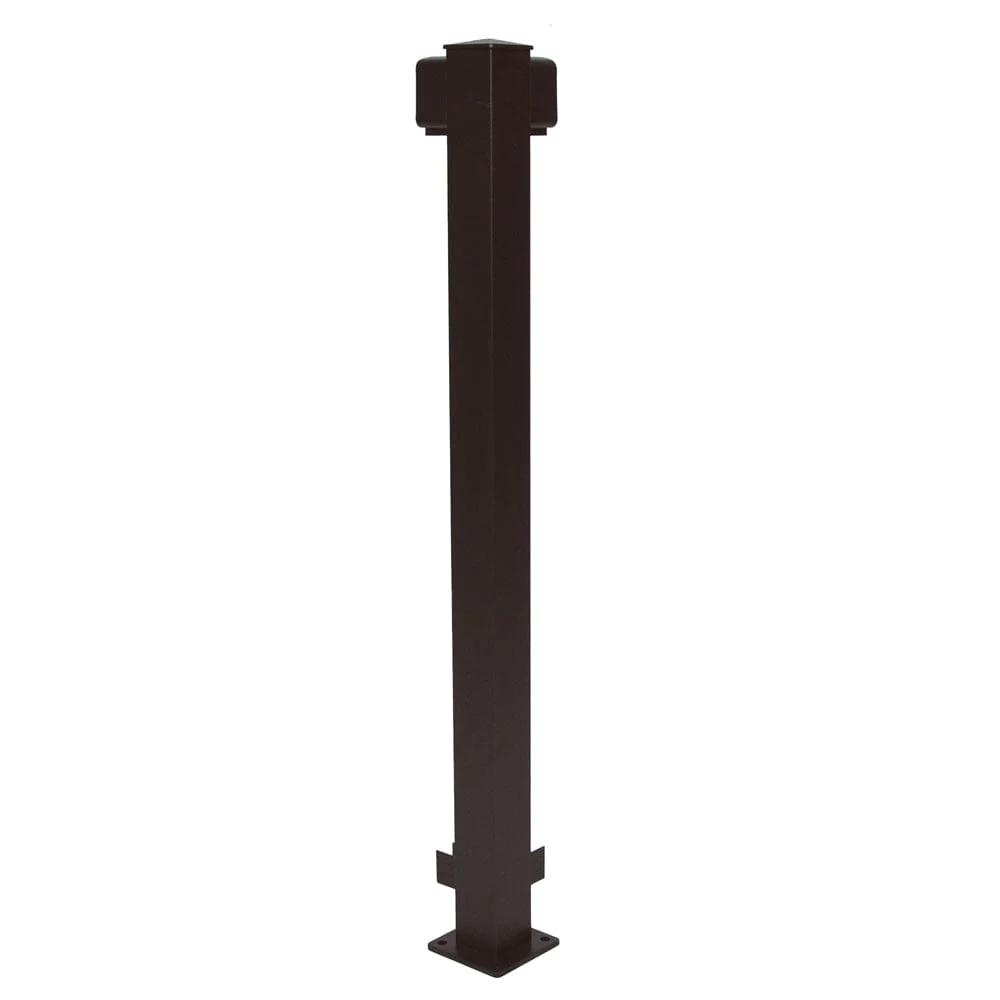 Post is 2-1/4" square and comes complete with post cap and welded brackets at 90 degrees to connect rails to post