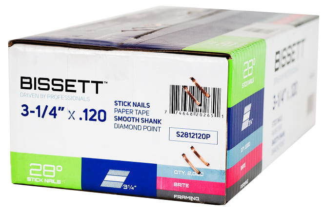 Strip Framing Nails, 3-1/4" x .120, 31-Degree, Paper-Collated, Smooth Shank, Brite Finish, 3000/box Product Code: S31121203M $47.99 Each Add to Cart